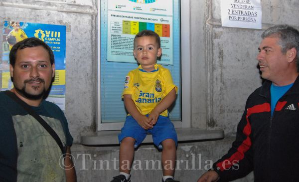 El primero de la lista es Pedro Ángel Gil, colocándose junto al lugar sagrado durante unas horas: la ventanilla. Pero otros compañeros de la madrugada ya están dispuestos con sus coches aparcados en el solar cercano a las puertas de Grada Curva. Significativo el cartel de "Vamos UD" que muestra Juan Sánchez, de Arinaga, que hará noche allí junto a su hijo Juanfra y Roberto Sosa. Son ellos los que comienzan la animación de noche tan larga que dará paso al día en que la UD Las Palmas puede volver a la Primera División.