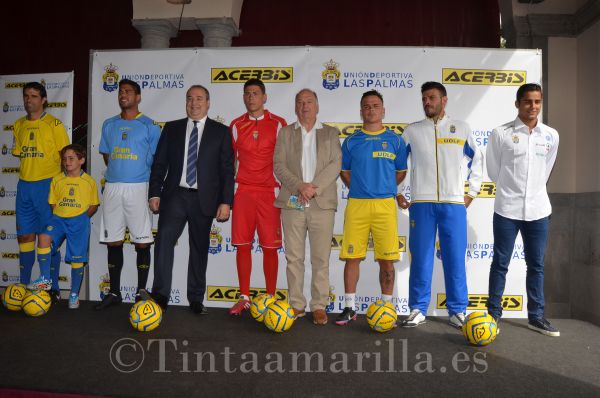 La UD Las Palmas exhibió este martes las nuevas equipaciones para la temporada 2014/2015, diseñadas por la firma italiana Acerbis, nueva empresa con la que el club representativo firma un convenio. La vestimenta reserva del conjunto grancanario homenajea en esta oportunidad al Marino FC -uno de sus cinco fundadores, fundado en 1905-, con su celeste en la camiseta, blanco en el pantalón y negro en las medias. En las camisetas lucirá el escudo en el centro del pecho de los jugadores y en el pantalón la bandera de Canarias porque "somos el equipo representativo de Canarias, lo estamos demostrando", dijo el presidente Miguel Ángel Ramírez. A la espalda de los jugadores lleva el año de nacimiento de la entidad: 1949.