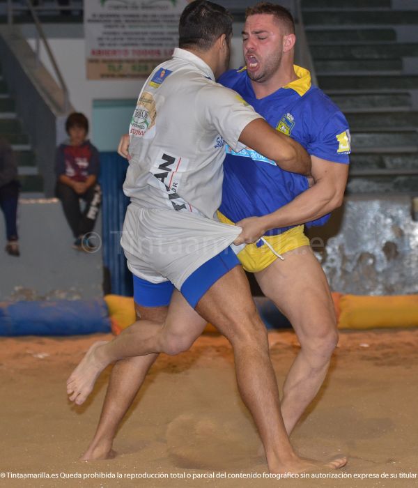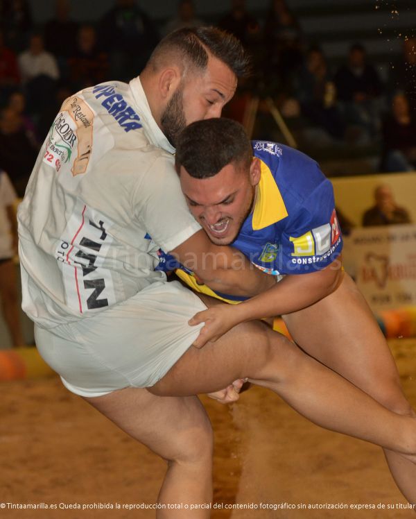 La luchada resultó de poder a poder entre los dos equipos y la victoria viajó a Ingenio. Pero el finiquito tenían que darlo los puntales. La primera agarrada resultó decisiva. En 34 segundos Carmelo y Agustín recibieron sendas amonestaciones por pasividad y el bregador visitante una más por posición de la cabeza. Eso llevó a una disyuntiva a González, que estiró un ataque en toda regla a su oponente, para evitar una eliminación prematura.