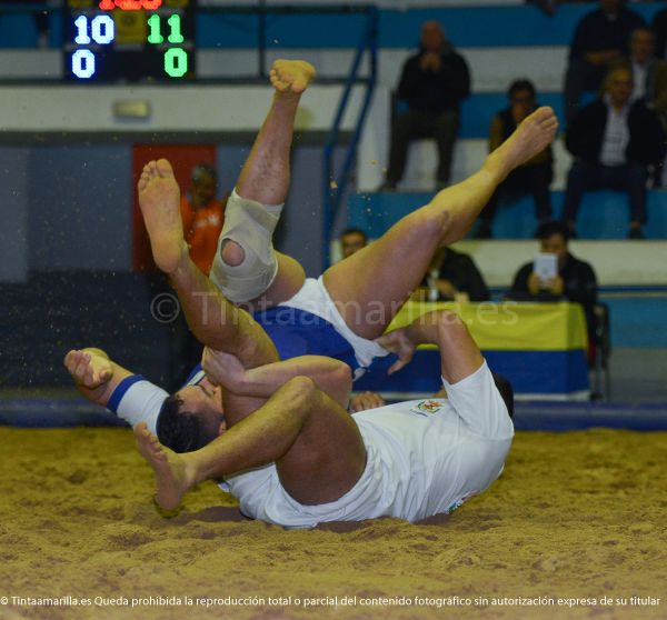 El encuentro duró apenas una hora y unos pocos minutos. La mayoría de las agarradas se resolvieron por la vía directa y se produjeron, además, dos eliminaciones mutuas por amonestaciones: Raúl Guedes y Abián Guillén, por una parte, Norberto Morales y Tomás del Toro, de otra. Este reparto de puntos parecía convenir más al conjunto visitante, porque lograba dejar en solitario a Medianito IV en el cruce frente a Carmelo Rodríguez del Toro. Pero el puntal A estuvo muy seguro. Un toque p'atrás le puso en posición ganadora en la primera agarrada, que luego completó con un segundo derribo tras cogida de muslo.
