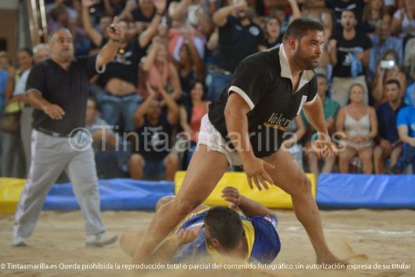 Rayco Tejera también tuvo su cuota de protagonismo, erosionando al Castro Morales en la zona media. Entre sus cuatro eliminados figura Jonay Alemán. Un mal cálculo en la cadera del destacado A del equipo teldense le hizo perder el equilibrio y llegar antes a la arena que Suárez.