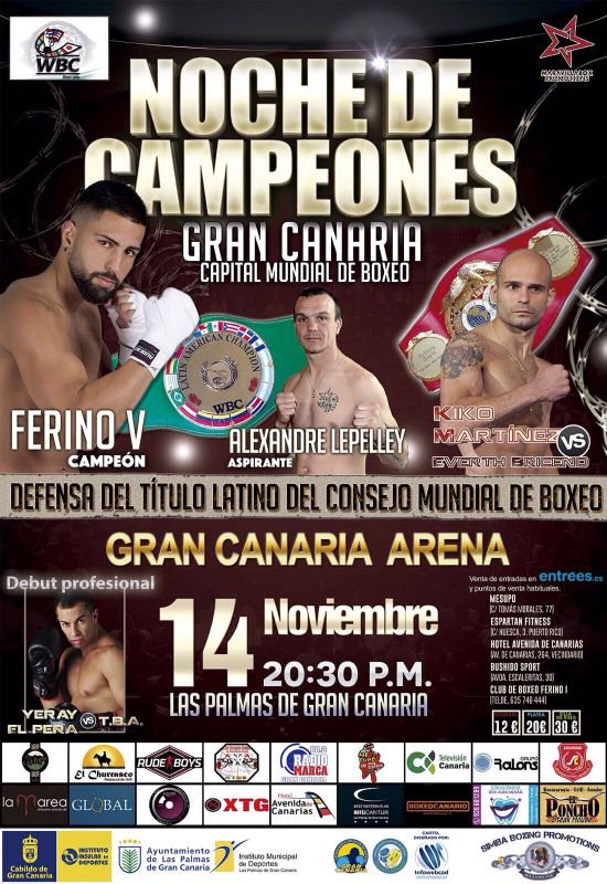 La velada ´Noche de Campeones´ comenzará a las 20.30 horas en el Gran Canaria Arena. El aforo será de 4.000 espectadores. El evento está promovido por Simba Box Promotions y Maravilla Box Promotions, además de contar con la colaboración de las federaciones Canaria e Insular de Gran Canaria de boxeo.