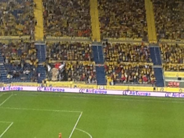 Pañuelos negros. La afición de la UD Las Palmas no aguanta más. Se organizó una protesta en el minuto 12 de partido en la grada del Gran Canaria. Los seguidores, durante un minuto, mostraron bolsas negras de basura y prendas negras. Una protesta así no se recordaba en el estadio, contra los arbitrajes recibidos por el equipo amarillo y contra el presidente de la Liga, Javier Tebas. Y una pancarta con una tarjeta roja en la grada Sur ... también.