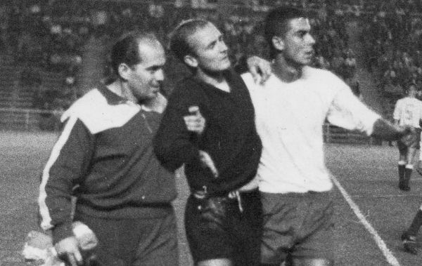 Ulacia abandona golpeado el terreno de juego, junto al masajista Pepe González y a Juan Guedes (Archivo Norberto Rodríguez)