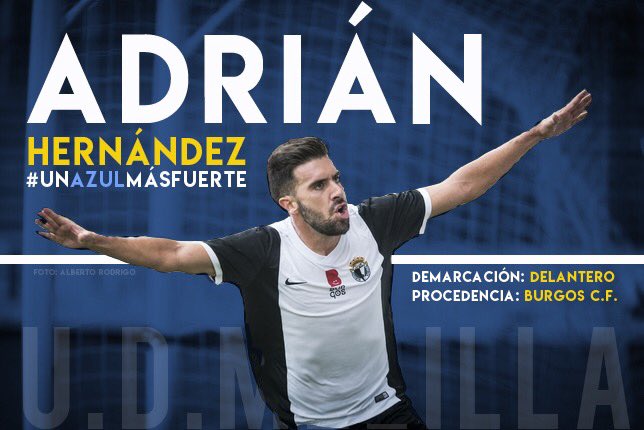 El gesto de bienvenida del Melilla al ex goleador amarillo es amplio. Dice de el que "tras el genial curso futbolístico llevado a cabo por Adrián en Las Palmas Atlético, y tras el descenso del club canario a Tercera, fue el Burgos C.F. quien reclamó los servicios del delantero en calidad de préstamo. Aquella temporada, la 2015/16 y con 23 años, Hernández repitió cifra (once goles anotados), maravillando a una afición burgalesa que le otorgó el trofeo Lucio Arnáiz a "mejor jugador de la temporada".