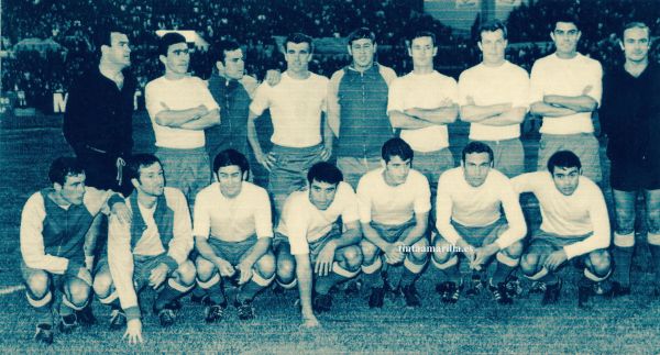 La formación de la UD Las Palmas (y suplentes) el 29 de mayo de 1968. Ya de amarillo, para jugar: Betancort (portero), Aparicio, Tonono, José Luis, Castellano, Guedes -arriba-, León, Gilberto II, Barrios, Germán y Pepe Juan (NR)