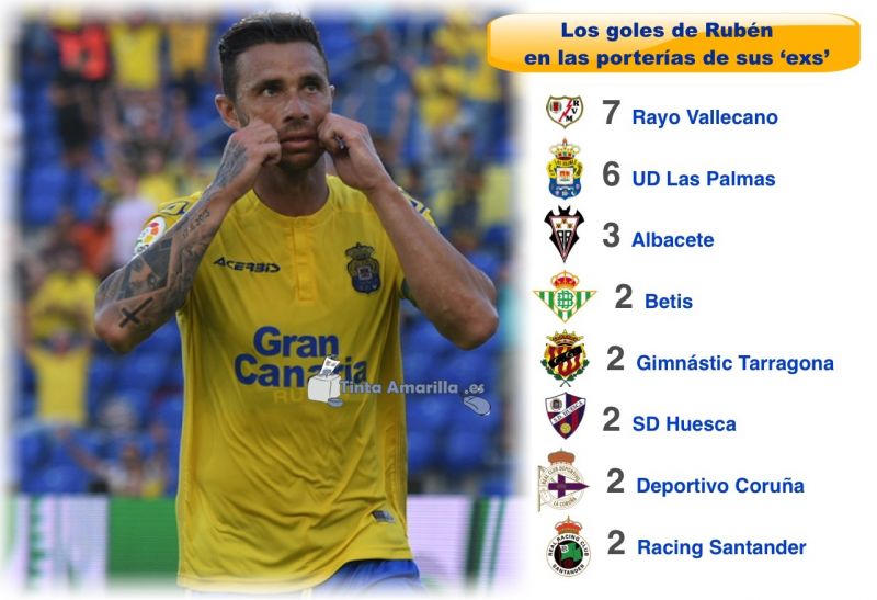 Rubén ha marcado en las porterías de los ocho equipos a los que tocó defender en el fútbol profesional español. La del Rayo Vallecano (7 dianas) es la más castigada, seguido por la UD Las Palmas (6).