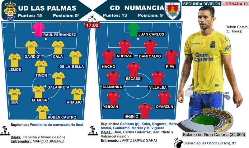 El partido ante el conjunto soriano tiene algo singular con respecto a los nueve anteriores de la Liga: la necesidad de gol de la UD Las Palmas y de volver a sumar puntos en forma de victoria es una prioridad. Y para ello toda la artillería de Manolo Jiménez está disponible y rodada, dispuesta a salir a torpedear la muralla numantina que se edifiquen en el Estadio de Gran Canaria.