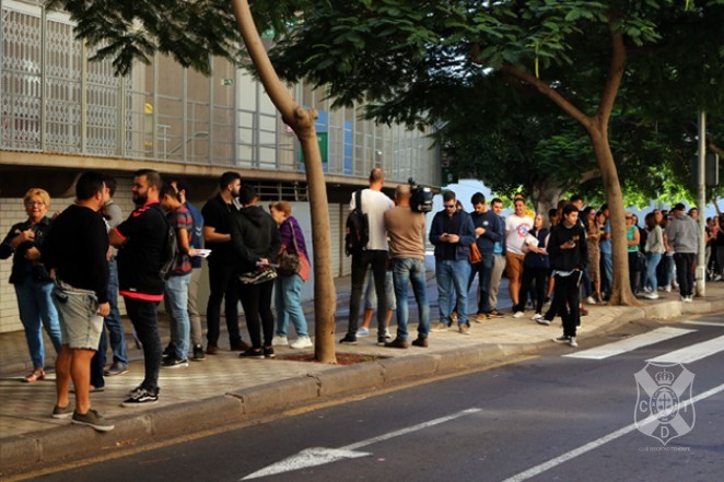 Tras solucionar el lío de los pasados días, desde este viernes, a las 10:00 horas, ya se han podido ver las primeras colas las taquillas del Estadio Heliodoro Rodríguez López, para adquirir las entradas para el derbi canario, exclusivamente para abonados del conjunto blanquiazul. El abonado podrá adquirir hasta el próximo martes, día 4 diciembre inclusive, una entrada a su nombre y otra para un acompañante, al precio único de 35 euros cada una, sujeto a disponibilidad. El abonado deberá retirar la localidad de manera presencial en las taquillas del #HRL o en su caso habilitar con una autorización escrita y fotocopia del DNI a otra persona.