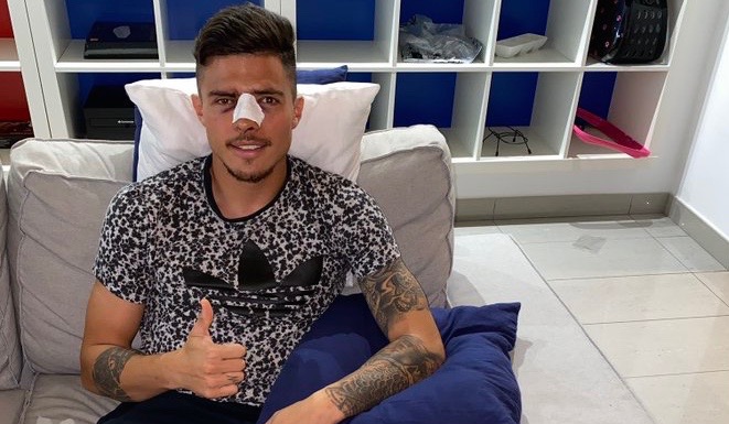 El diagnóstico es de fractura-hundimiento de ambas órbitas a nivel del hueso frontal, lesión de seno maxilar y fractura-luxación de huesos nasales. Se espera que pueda volver a jugar en dos o tres semanas utilizando una máscara facial", termina el club.