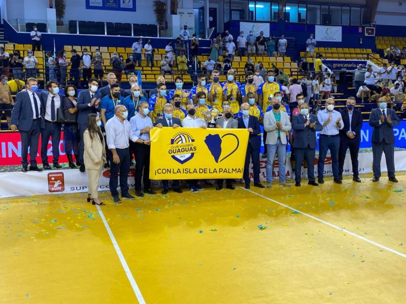 El Guaguas celebra el título de Supercampeón de España, tras ganar con absoluta autoridad al Voley Palma este domingo. 3-0 en el Centro Insular de Deportes, con la actuación estelar de Yosvany Hernández, que con 24 puntos en su cosecha personal, fue elegido MVP del partido. Ambos equipos llegaban a la cita tras una pretemporada irregular pero que les servía para ajustar las nuevas piezas de una maquinaria con la que ambos equipos pretenden dar mucha guerra este curso en la competición doméstica.