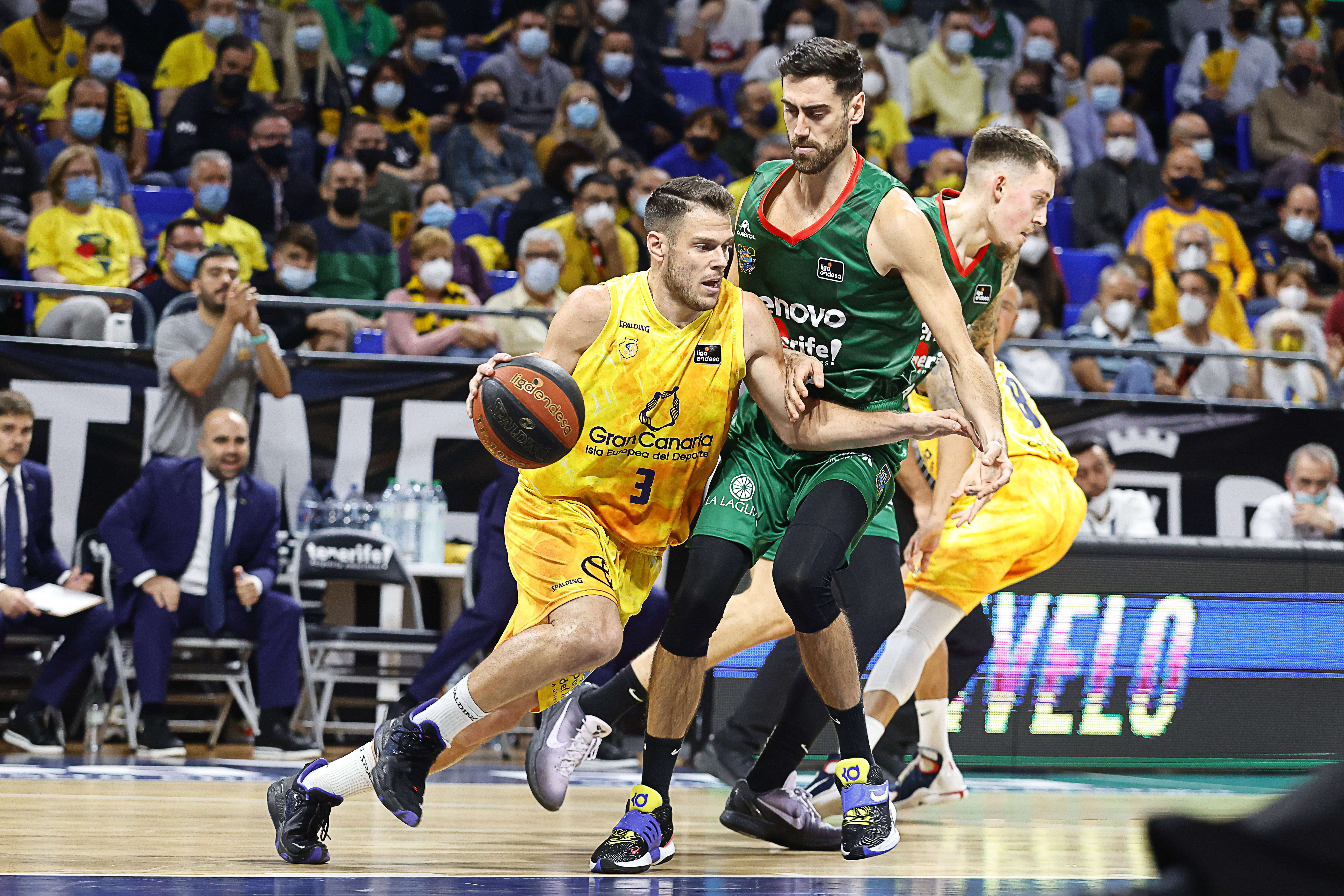 Respondió todo el choque a las expectativas. Desde el comienzo se vieron los estilos anotadores preferidos de ambos conjuntos. El Tenerife, sacando oro de sus tiros alejados de la canasta, y el Gran Canaria haciendo buenos los centímetros de Ilimiane Diop y Pustovyi para, cerca del aro, tomar la iniciativa. Los locales, con menos necesidad de anotar llevaban el mismo ritmo de puntuaciones de un Granca, que trataba de hacerse con el tempo de juego. Así, 3-6 fue la máxima renta del choque en los primeros diez minutos de juego que acabarían con ventaja del Tenerife 23-21, pese a la resistencia ofensiva que estaba ofreciendo D.J. Slaughter (12 puntos en el primer cuarto).