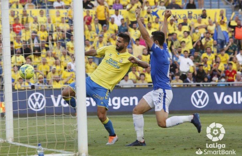 Pero el golpe a la UD Las Palmas lo completó Pérez Pallas, en la sala VAR, y el colegiado del partido. Al borde del descanso decidieron que un salto de Navas (despejando de cabeza el balón) acabara en pena máxima. Contactó en el salto con el rival que tenía a su espalda, Mollejo, y el árbitro interpretó que era meritorio de la pena máxima.
