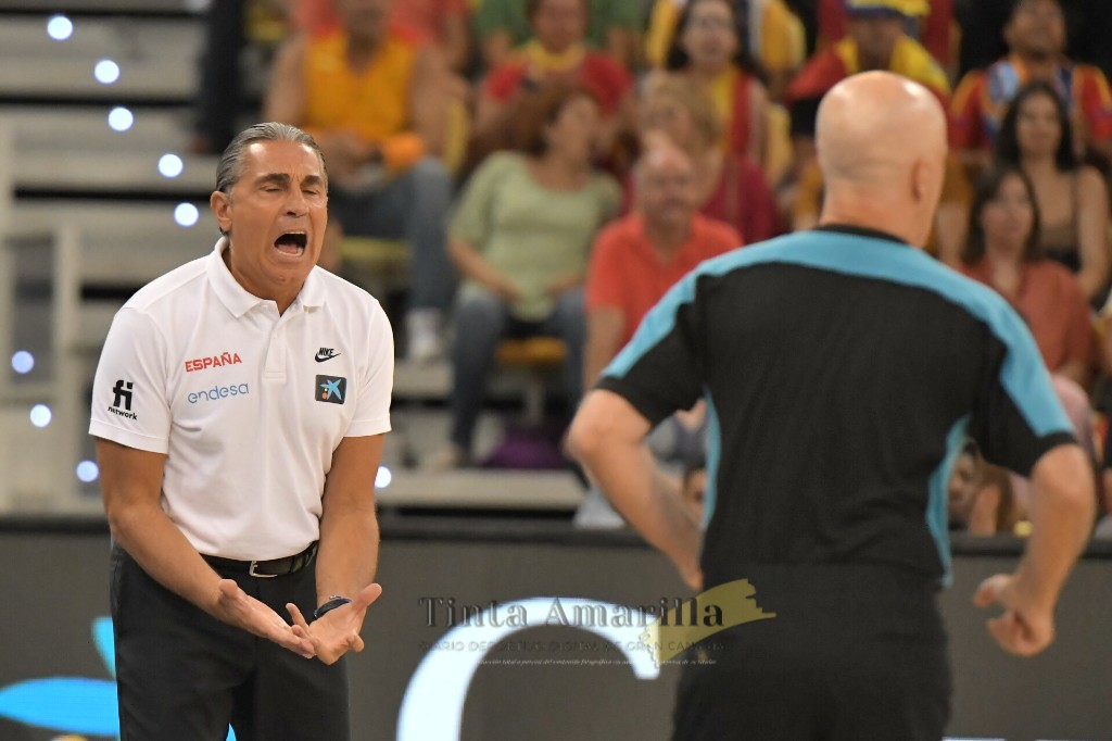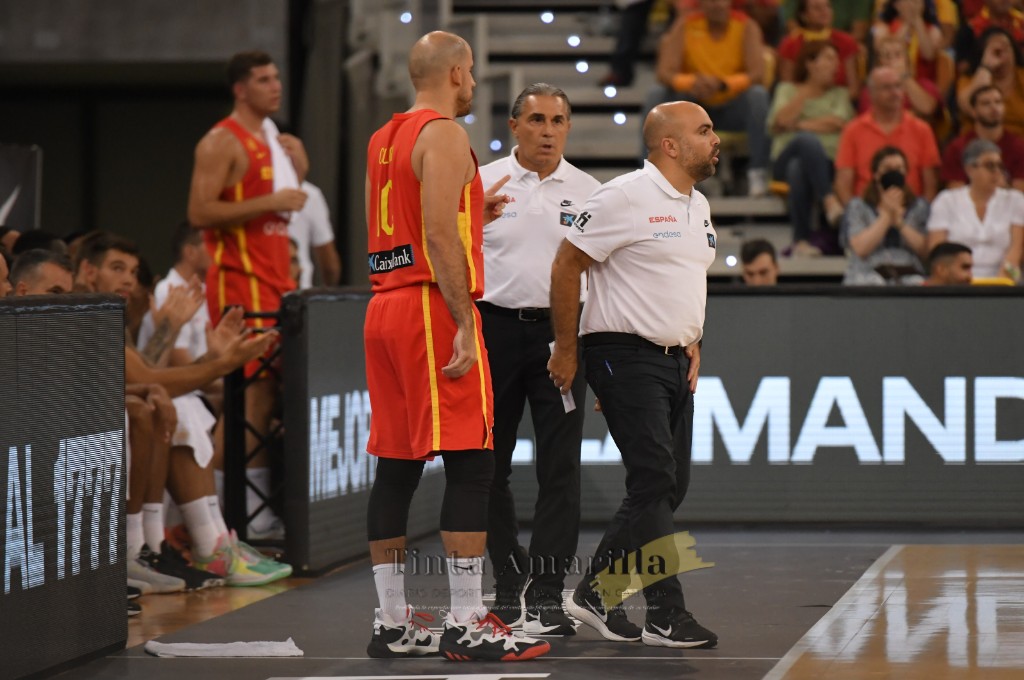 El partido comenzó con cierta fluidez en ataque, pero con el paso de los primeros minutos España se fue atascando en sus jugadas. Scariolo se vio obligado a parar el encuentro con 9-17 en el marcador, percatándose de esa circunstancia de circulación espesa y erráticos lanzamientos.Había probado incluso a Garuba, que jugaba en el Gran Canaria Arena sus primeros minutos de preparación, aunque instantes después lo sentaba para dar paso al local Fran Guerra.
