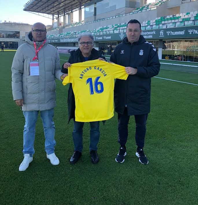 Nada más acabar el partido de octavos de final de la Copa del Rey juvenil, Roberto Arocha (miembro del departamento de captación y formación de la UD Las Palmas) mostró el detallazo de filiales con Arturo García, una persona muy querida en la entidad y fuera de ella. Junto a Tonono Rodríguez y Suso Hernández, responsables del departamento mostraron una camiseta con el nombre del malogrado fisioterapeuta y el dorsal 16, las temporadas que estuvo como auxiliar en la UD Las Palmas. Arturo García se llevó este miércoles una alegría, allá donde esté.