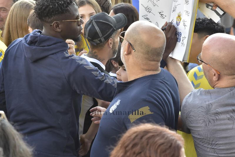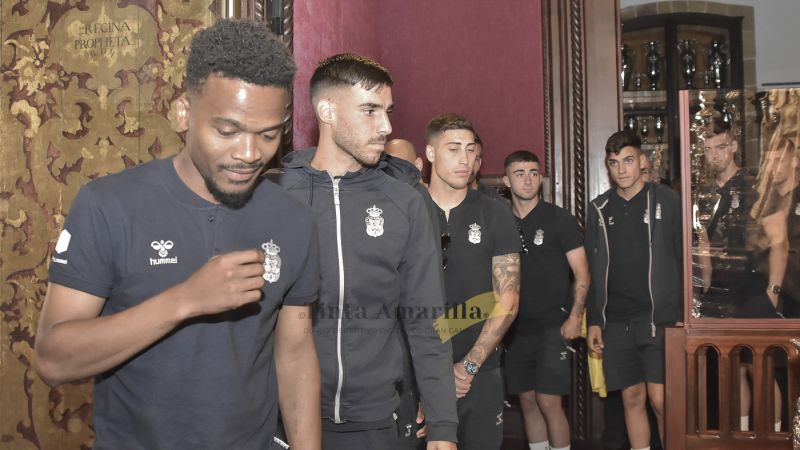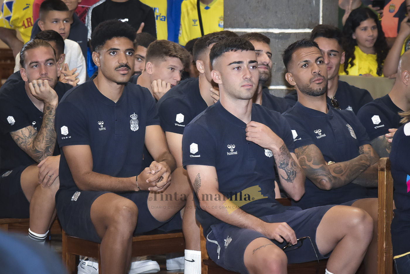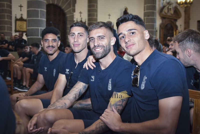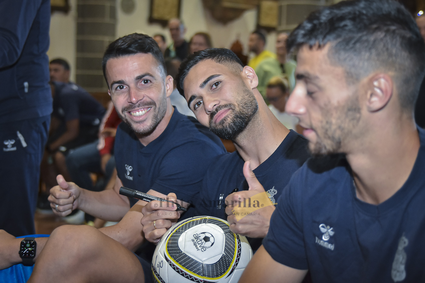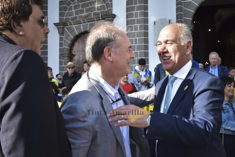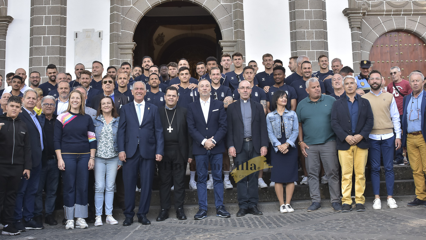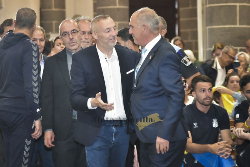 El obispo de Canarias, Cristóbal Déniz, también se sumó a la causa del equipo amarillo. Estuvo presente en el acto e intervino para recordar los valores de unidad que lograron los miembros del equipo y que “han regalado un ascenso con su esfuerzo”.