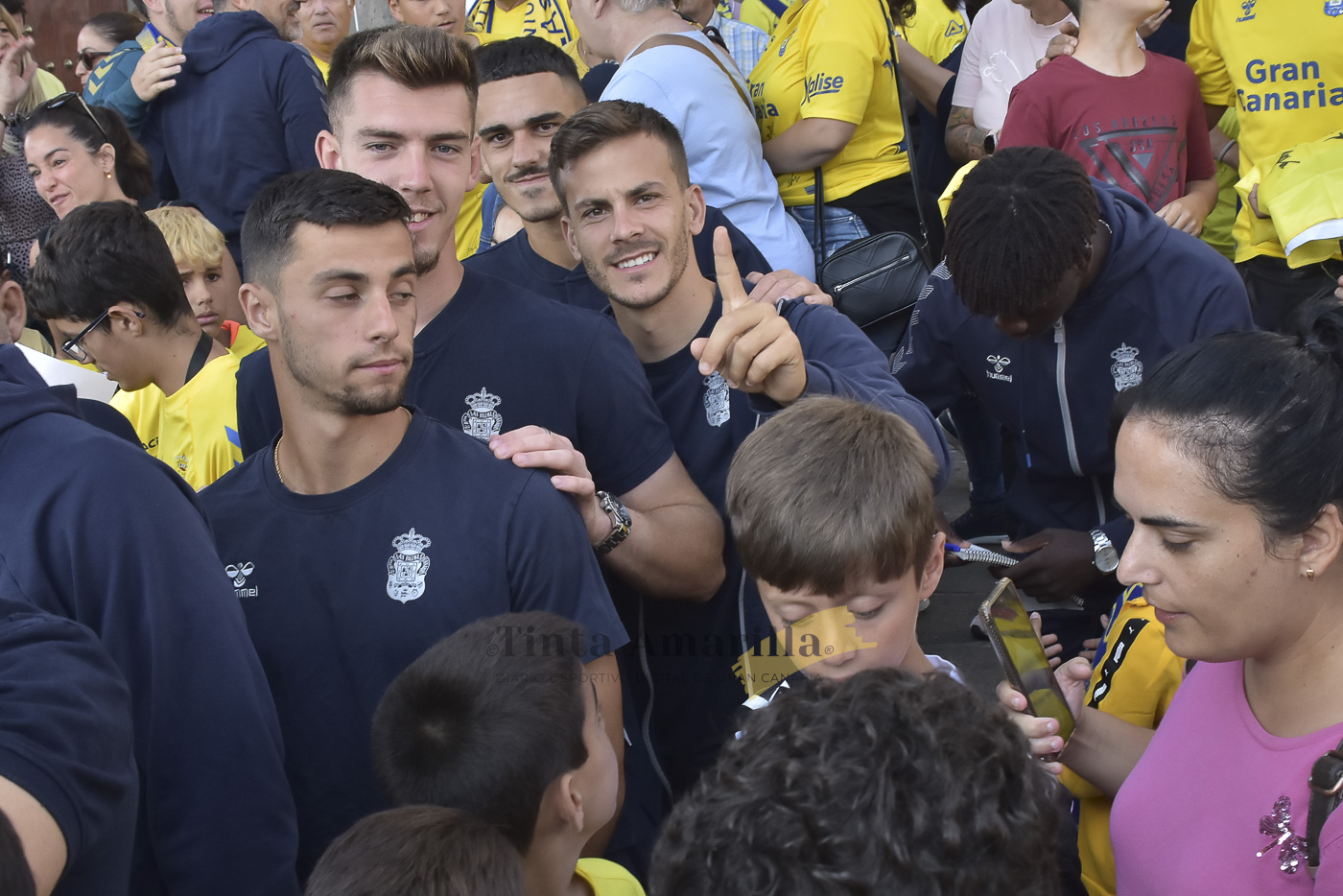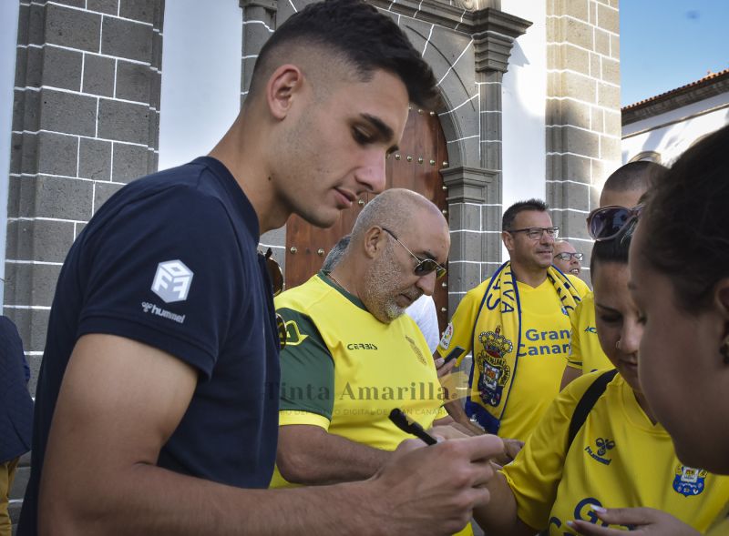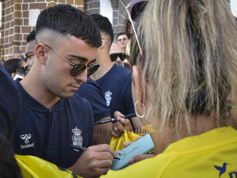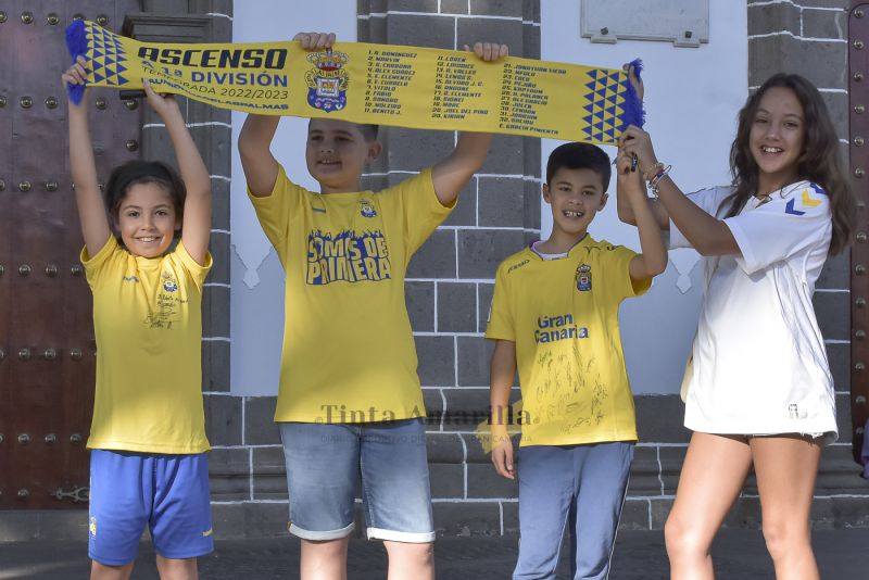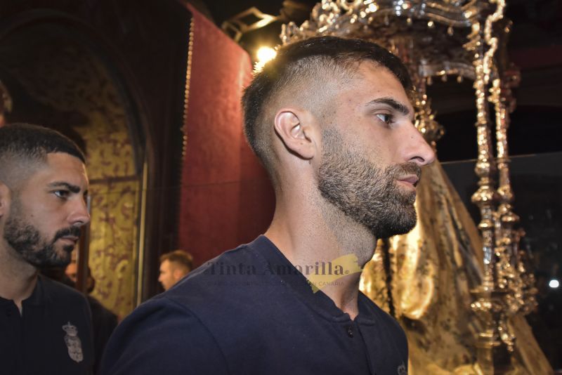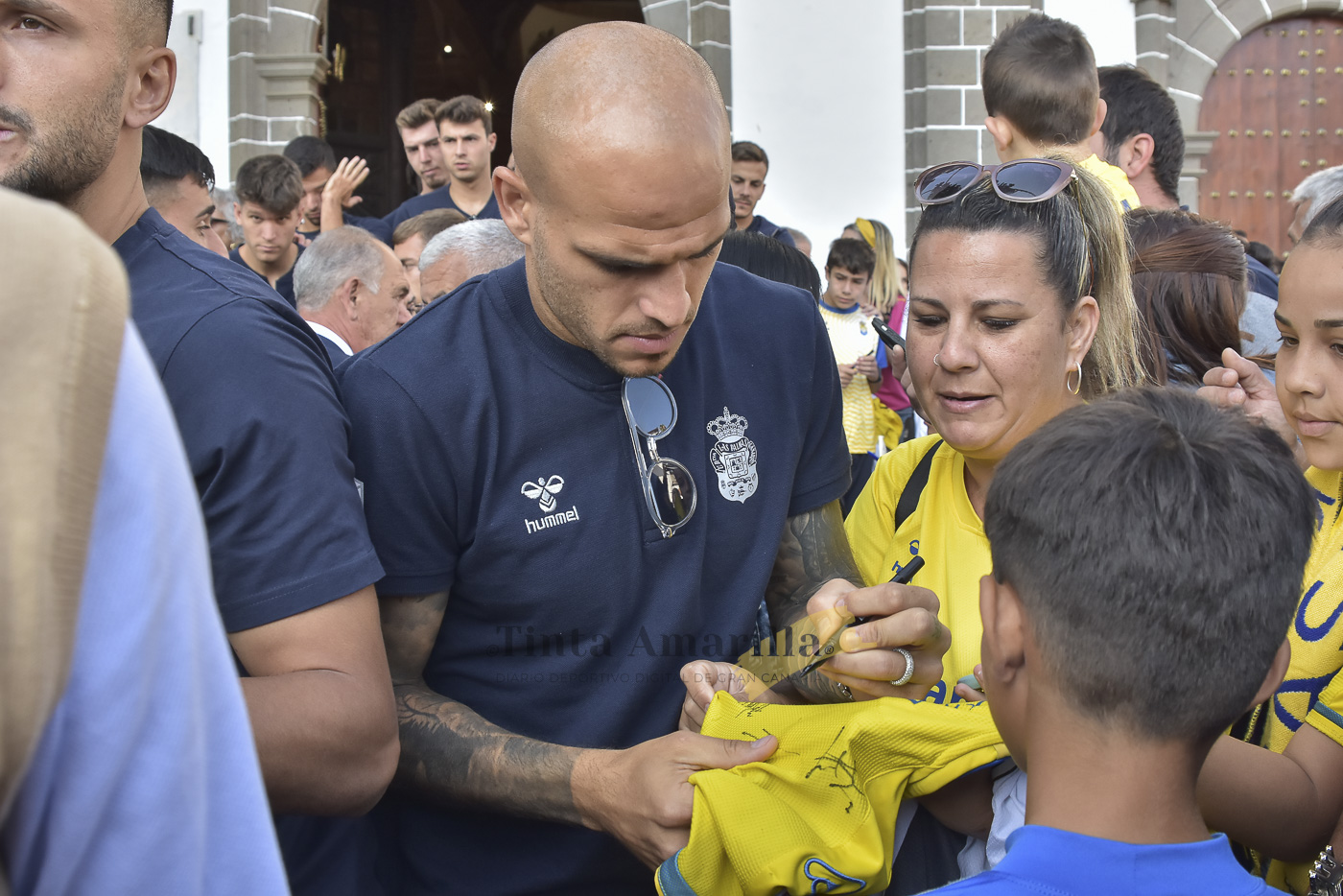 “¡Que viva la Virgen del Pino!. ¡Que viva la Unión Deportiva Las Palmas!”. La primera escena de la semana post retorno a Primera tuvo lugar en el origen de la campaña: La visita a la Patrona para brindarle el éxito deportivo cosechado, al margen de una ofrenda floral.