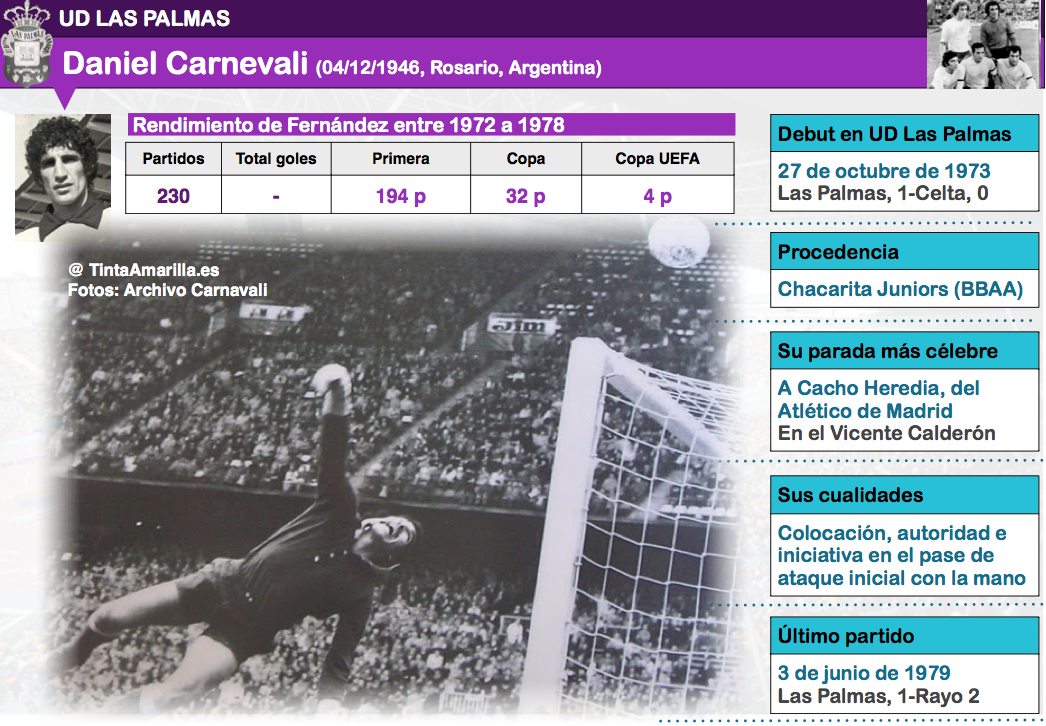 Este 27 de octubre de 2023 es fecha subrayada. Se cumplen 50 años del debut en la UD Las Palmas de Daniel Carnevali, el arquero internacional argentino que el 27 de octubre de 1973 hizo su estreno de amarillo en un partido de Liga de Primera División frente al Celta de Vigo.