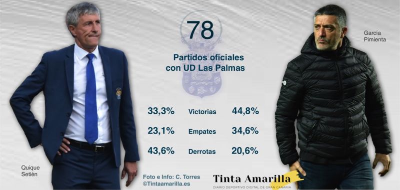 El actual entrenador de la UD Las Palmas lleva más victorias (35) y empates (27), además de menos derrotas (16). El balance respectivo de Setién era de 26 triunfos, 18 empates y 34 pérdidas.