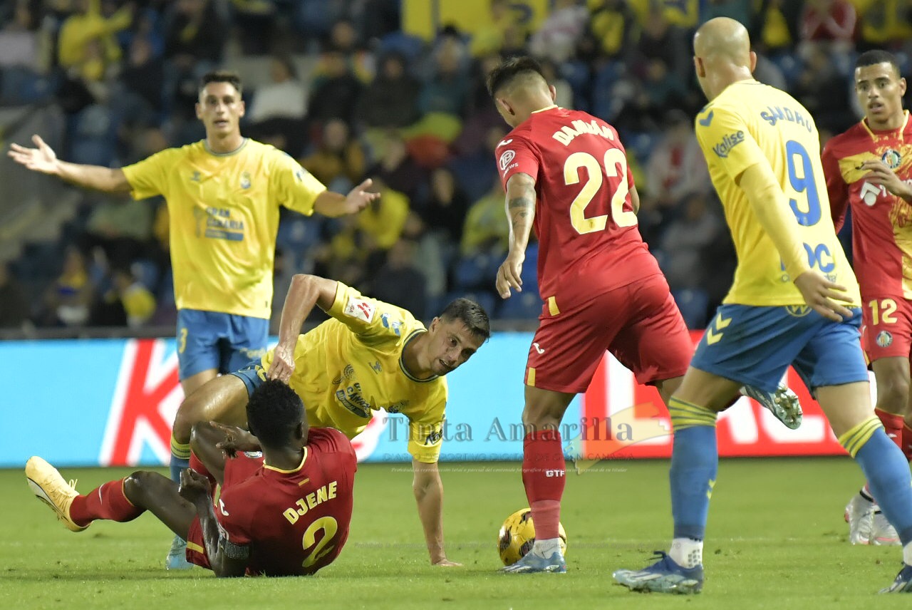 El partido tenía en su origen una deriva esperada. Las Palmas congregaba a sus jugadores para organizar jugadas y el Getafe se situaba en varias hileras para formar un muro rojo de diez jugadores y portero. Y si había una fisura, el recurso de la falta táctica.