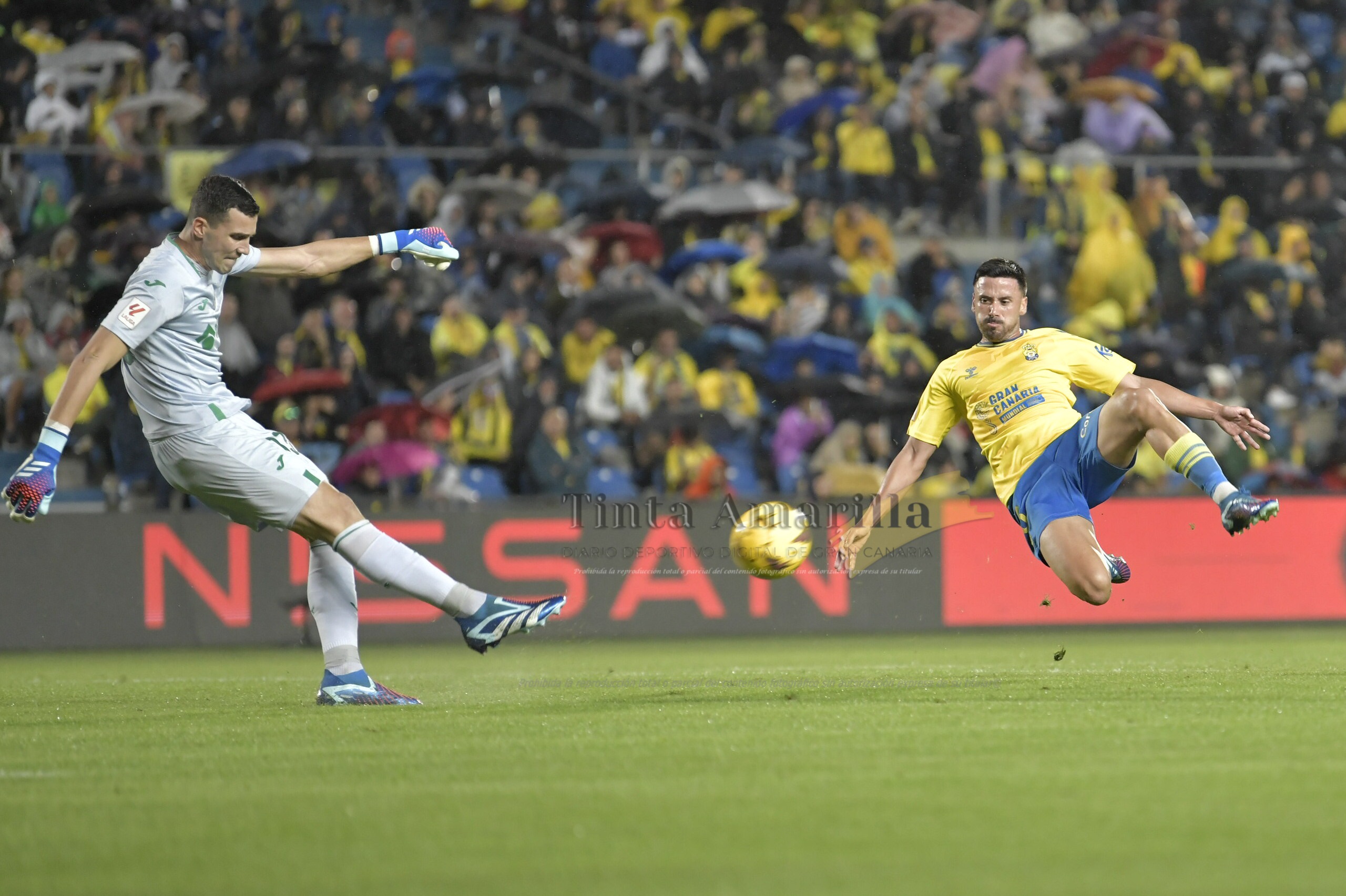 Sin embargo la noche iba a cambiar en el minuto 42, tras un centro de Kirian y un magnífico remate de cabeza de Julián Araujo. El mexicano rectificó en el aire y envió el primer balón con la testa de la temporada a las redes rivales. Y antes del descanso, todavía Las Palmas pudo sumar un segundo tanto con un remate potente de Sandro que salvó Soria.