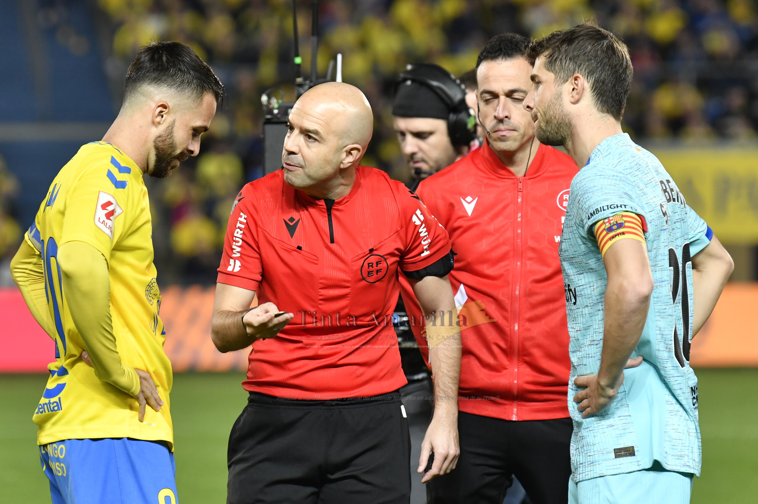 Arbitro: Pablo González Fuertes (Colegio Asturiano). Tarjetas amarillas a Álex Suárez, Coco, Javi Muñoz, Sergi Cardona, Kirian (Las Palmas), Yamal y Sergi Roberto (Barcelona). También al técnico visitante Xavi Hernández. Roja directa a Sinkgraven (m. 90).