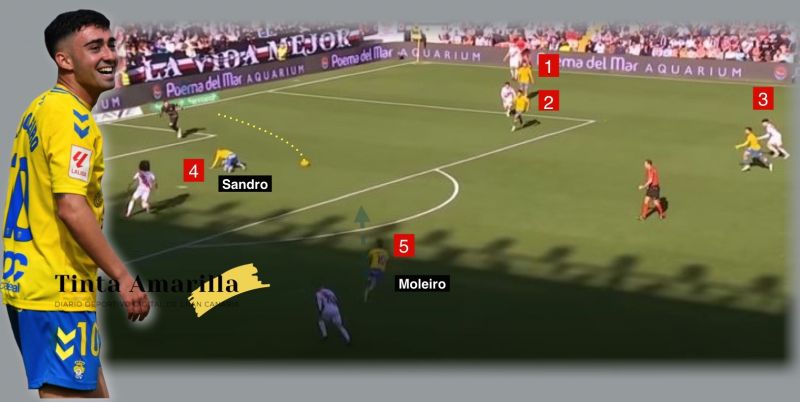 Al rebobinar la escena se aprecia un ataque en jauría de los cinco avanzados de la UD Las Palmas (Muñoz, Kirian, Munir, Sandro y Moleiro) que se asocian en una presión a la par con agobiados cinco zagueros del Rayo. Posiblemente al conjunto de Francisco Rodríguez le faltó en alguna posición un mediocentro más que fuera visible, un conector que liberase del corsé adversario a los cinco compañeros vallecanos y al portero.