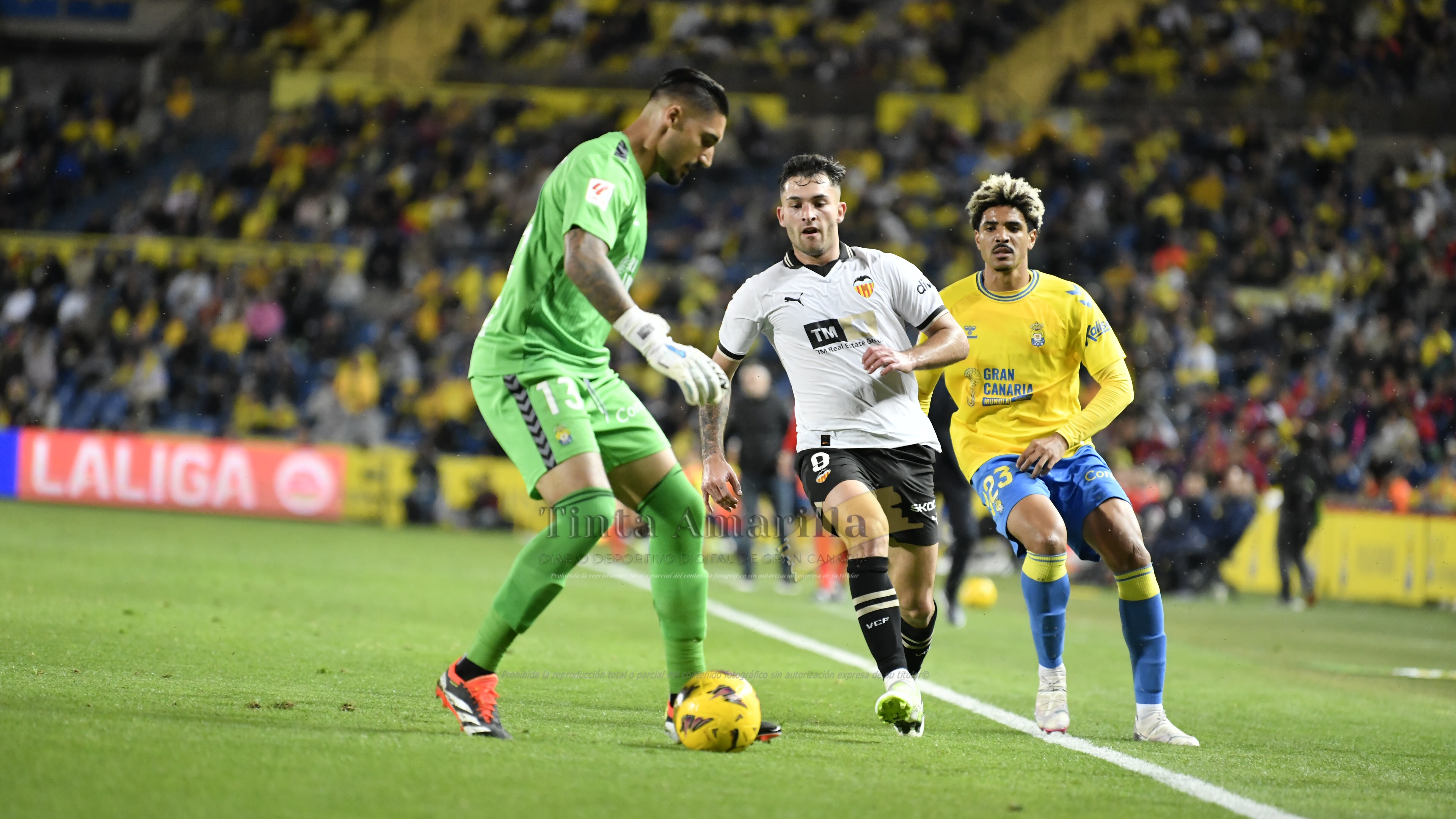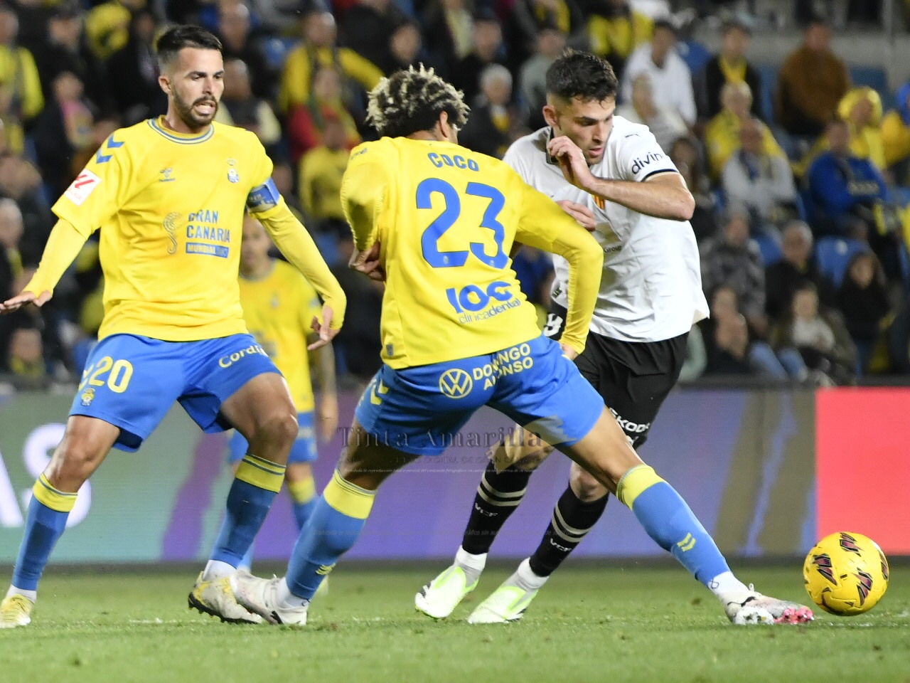 Así que el desgaste pasaba por la distribución del juego amarillo, en el que Alberto Moleiro había desaparecido esta vez del once titular. Kirian, Perrone y Javi Muñoz fueron los tres vértices del triángulo organizativo local, con dosis de paciencia frente a dos líneas abundantemente nutridas en campo visitante.