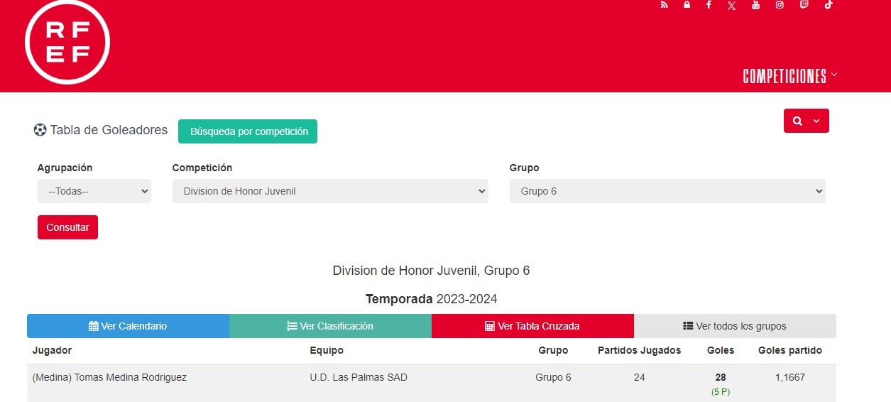 Hay que considerar que el grupo andaluz tiene un calendario de cuatro encuentros más que el grupo canario. De tal forma que cuenta el promedio de Pablo García (1,2308 goles por partido) frente al de Tomás Medina (1,1667 tantos por encuentro).