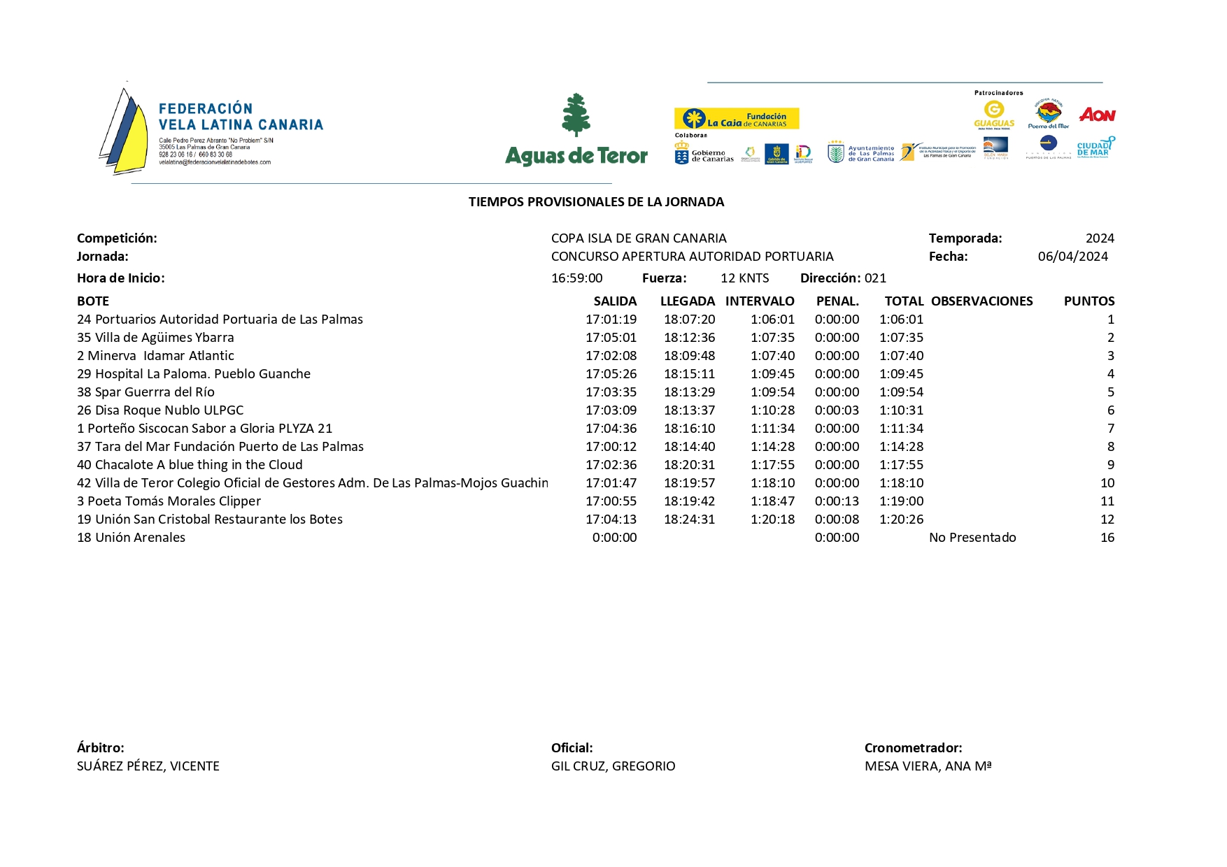 El vigente campeón de la Copa Isla de Gran Canaria, el Hospital La Paloma Pueblo Guanche, fue cuarto en esta primera prueba de la Copa Isla de Gran Canaria. El bote liderado por Óliver Bravo de Laguna entró a más de 3 minutos del Portuarios. Le siguió el Spar Guerra del Río de Adrián Morales y el Disa Roque Nublo ULPGC, con el regreso de Gari Chocho a la caña de un bote de Vela Latina Canaria.