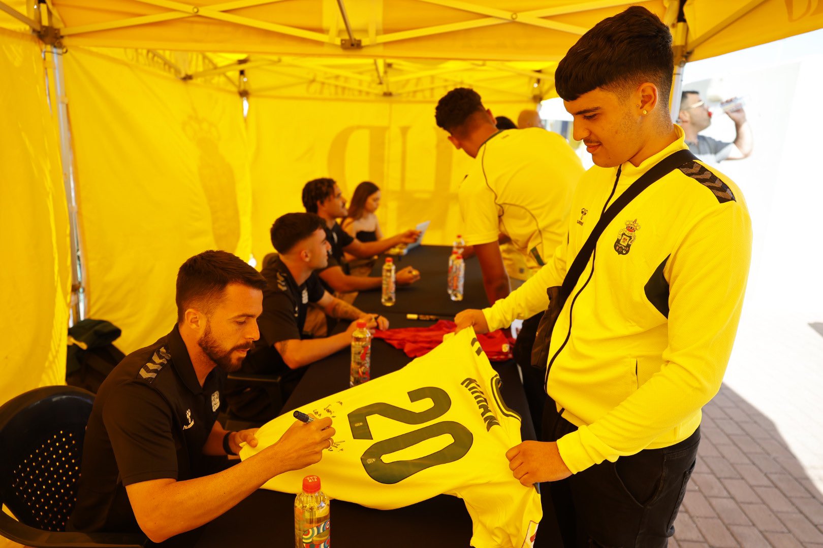 Centenares de aficionados de todas las edades acudieron este viernes a la tienda oficial de la UD Las Palmas. Allí estaban tres de los jugadores de cantera del equipo amarillo, Saúl Coco, Kirian y Moleiro, para cumplir con un acto de firmas y solicitudes varias de los aficionados.