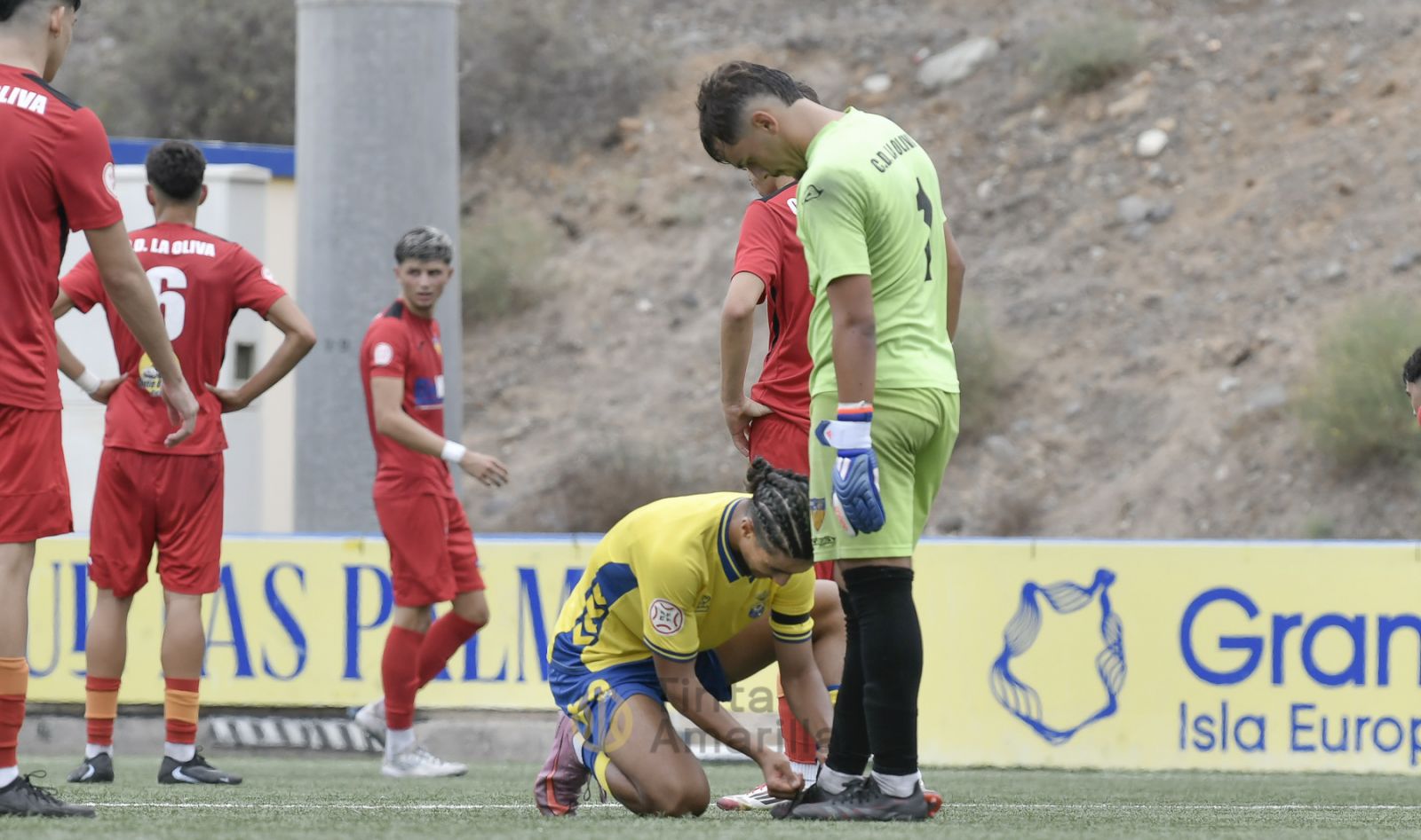 La imagen es del inicio de la Liga canaria juvenil. El delantero amarillo, Aarón Berriel, ata las botas a su portero rival, Yael Hernández, de La Oliva. La solidaridad futbolística reside en estas etapas, aunque luego Berriel precisamente se encargaría de anotar los primeros goles de la temporada en el encuentro disputado en el Anexo.