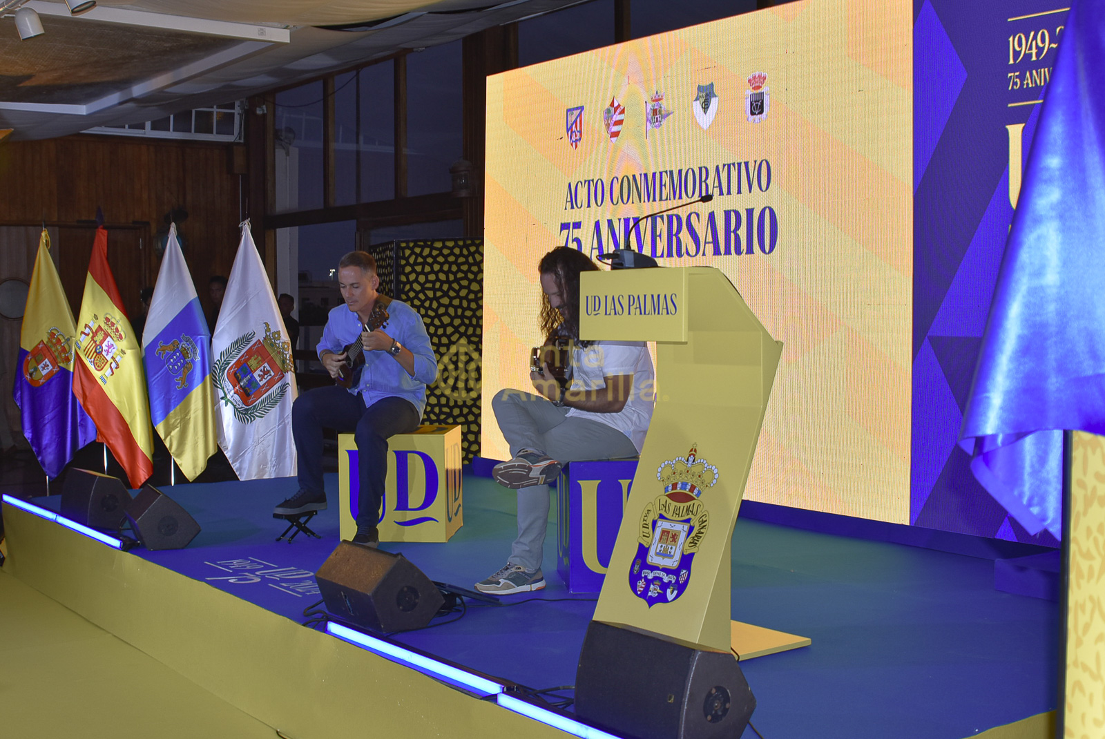 Ramírez y el pleno de su consejo de administración ejercieron como anfitriones en una mágica noche amarilla y azul que volvió a tener como escenario el Real Club Náutico de Gran Canaria. Allí, como colofón de una amena velada, se descubrió una placa conmemorativa del día que reza de la siguiente manera: “La UD Las Palmas celebró su 75 aniversario en estas instalaciones con el equipo en Primera División y con récord histórico de abonados”.