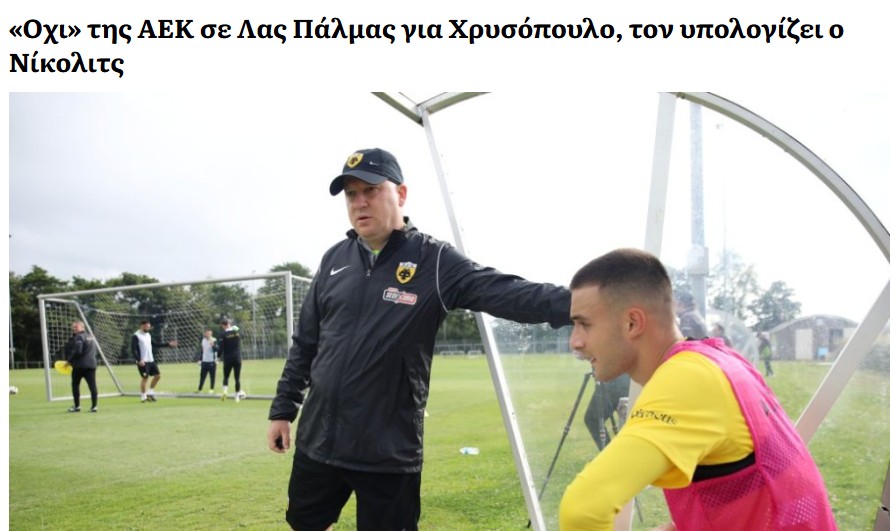 MIÉRCOLES, 23 DE JULIO. En Grecia ha salido el nombre de la UD Las Palmas asociado a un defensa central: Konstantinos Chrysopoulos (22), del AEK. Según Transfermartk, el jugador es zurdo, tiene contrato hasta 2028 y está tasado en 600.000 euros. La misma fuente helena afirma que la oferta estaría rechazada porque el nuevo técnico del AEK cuenta con el jugador.