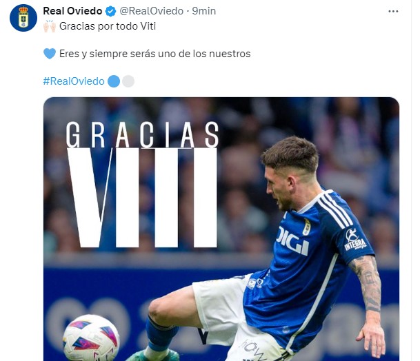 Mientras el Real Oviedo confirma la marcha de Viti Rozada tras doce años en la entidad. Lo despide con un mensaje en el que señala que “el jugador, nacido el 16 de septiembre de 1997, llegó al conjunto ovetense en la temporada 2012/2013 para formar parte del Cadete A y desde ese momento no ha dejado de trabajar hasta llegar y consolidarse en el primer equipo carbayón”.